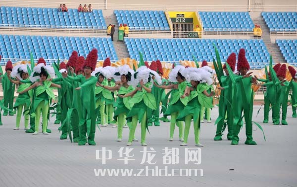 當(dāng)日16時(shí)30分許,伴隨著悠揚(yáng)的鐘聲,文體表演第一章“龍騰歡歌”拉開序幕,幾百名身著盛裝,手拿花環(huán)、紅綢的演員從4個(gè)方向快速向市體育場(chǎng)中心表演場(chǎng)地飛奔而去,在音樂聲中盡情舞蹈。表演隊(duì)伍中最吸引觀眾眼球的是一群身穿泥泥狗造型服裝的演員,他們獨(dú)特的表演十分引人注目。同樣出現(xiàn)在演出現(xiàn)場(chǎng)的還有擔(dān)經(jīng)挑、旱船、竹馬等反映周口獨(dú)特文化資源的文化元素,這些無疑成了第一章的最大亮點(diǎn)。
