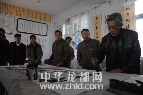 ????作為距離太康縣城最遠的一個邊界鄉(xiāng)鎮(zhèn),轉(zhuǎn)樓鄉(xiāng)的文化活動開展得有聲有色。該鄉(xiāng)依托文化站,成立了在鄉(xiāng)一級少見的文聯(lián),下設(shè)書法家協(xié)會、腰鼓協(xié)會、嗩吶協(xié)會等。我們在轉(zhuǎn)樓鄉(xiāng)政府采訪時,正碰上書法家協(xié)會20多名會員在一起切磋書藝。今年74歲的許家榮是鄉(xiāng)書法家協(xié)會主席,也是《周口晚報》的老讀者,看到我們到來,老人興之所至,當(dāng)場揮毫潑墨,為本報題寫了“周口邊界行接地氣有人氣”的條幅。據(jù)了解,每逢春節(jié),書法家協(xié)會會員都會走村串戶,為村民義務(wù)書寫春聯(lián)。