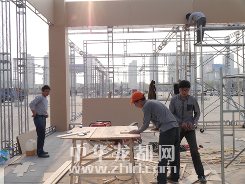 ????明日上午,由周口報業(yè)傳媒集團主辦的第13屆房車聯(lián)展將在市體育中心隆重開幕。為給前來觀展的市民提供優(yōu)質(zhì)的服務體驗及華麗的視覺享受,4月8日起,參展商家就已著手搭建展臺(如圖)。晚報記者 宋風 攝