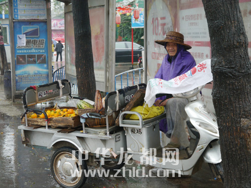 賣(mài)柿子的老人在公交車(chē)站避雨