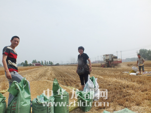 ??? 昨日,鄲城縣小麥?zhǔn)崭罾_序幕。圖為該縣城郊鄉(xiāng)小麥?zhǔn)崭瞵F(xiàn)場。(記者 盧好亮 通訊員 孫守功 攝)