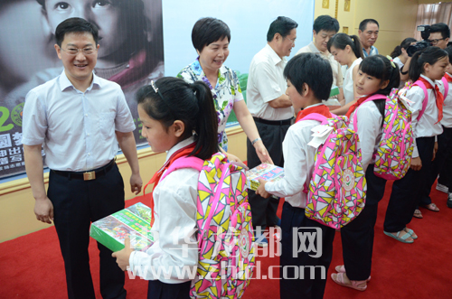 本報(bào)訊 為助力每一位貧困女孩實(shí)現(xiàn)美好的夢(mèng)想,7月13日,2015年“圓夢(mèng)女孩志愿行動(dòng)周口行”啟動(dòng)儀式在周口飯店舉行。啟動(dòng)儀式上,有關(guān)領(lǐng)導(dǎo)不僅為志愿者頒發(fā)了證書,為志愿者隊(duì)伍授旗,還為太康縣圓夢(mèng)女孩代表贈(zèng)送了書包和圖書。