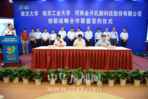 ????本報訊(記者 李莉) 7月9日上午,南京大學(xué)、南京工業(yè)大學(xué)、河南金丹乳酸科技股份有限公司創(chuàng)新戰(zhàn)略合作聯(lián)盟簽約儀式在鄭州舉行。副省長張維寧,中國工程院院士張全興,南京大學(xué)副校長談?wù)苊?,南京工業(yè)大學(xué)副校長喬旭,省科技廳廳長張震宇,市委書記、市人大常委會主任徐光,省環(huán)保廳副廳長師偉,市委常委、常務(wù)副市長劉保倉,市委常委、組織部長靳磊,副市長王田業(yè),及鄲城縣主要領(lǐng)導(dǎo)、河南金丹乳酸公司主要負責人出席簽約儀式。