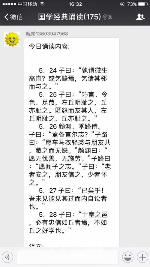 ????建立該微信群的是團(tuán)市委工作人員劉曉靖。劉曉靖告訴周口晚報(bào)記者,建立該微信群的目的是想讓大家多讀讀國(guó)學(xué)經(jīng)典,增加大家的文學(xué)涵養(yǎng),讓大家養(yǎng)成讀書(shū)的習(xí)慣?!皠傞_(kāi)始只有十幾個(gè)人,大家有些不好意思,有的人覺(jué)得自己讀得不好張不開(kāi)口,我就做一些示范,引領(lǐng)大家誦讀。不久,加入微信群的人多了,通過(guò)幾個(gè)人帶動(dòng),大家誦讀的就多了?!眲跃刚f(shuō),讀的方式就是大家通過(guò)微信的語(yǔ)音功能,讀一些《論語(yǔ)》中的經(jīng)典句子。過(guò)了一段時(shí)間,大家對(duì)這種方式越來(lái)越認(rèn)可,加入該微信群的人也越來(lái)越多,人數(shù)從剛開(kāi)始的十幾個(gè)人增加到近200人?,F(xiàn)在,該微信群里不但有電臺(tái)、電視臺(tái)的專業(yè)主持人,而且有一些學(xué)者。以前拿不準(zhǔn)的字,現(xiàn)在都會(huì)有人講解,大家也有了學(xué)習(xí)對(duì)象。這個(gè)微信群從成立到現(xiàn)在,《弟子規(guī)》、《大學(xué)》、《中庸》、《論語(yǔ)》已讀一遍,四書(shū)里面只剩下《孟子》還沒(méi)有讀。