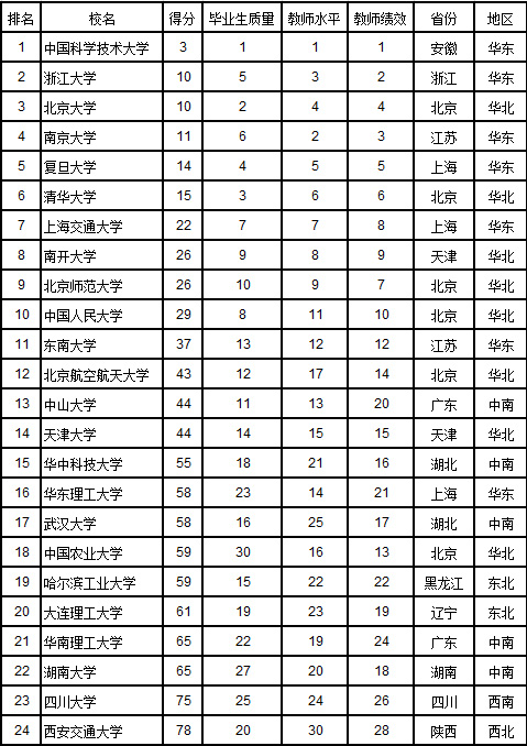 將滿足上述3項條件的大學的3項排名名次相加后升序排列,得分越低越好。得分相同,教師平均學術(shù)水平高的大學居前。