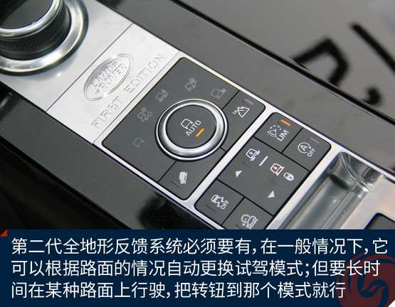 第二代全地形反饋系統(tǒng)必須有,它的特點(diǎn)是在任何非AUTO模式下,且車速低于50公里/時,車身會自動升高75毫米,以此應(yīng)對復(fù)雜越野需求。而全地形反饋系統(tǒng),同時能夠提升車輛的發(fā)動機(jī)、變速箱、中央差速器和底盤的性能,使駕駛者可以根據(jù)具體地形選擇合適的駕駛模式。