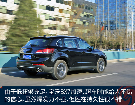 動(dòng)力方面寶沃BX7擁有一臺(tái)2.0T渦輪增壓直噴發(fā)動(dòng)機(jī),目前在售的均為高功率版本,擁有165千瓦的最大功率和300牛頓·米的峰值扭矩,這臺(tái)2.0T發(fā)動(dòng)機(jī)是寶沃聯(lián)合德國(guó)FEV公司共同研發(fā),最大功率數(shù)據(jù)可觀,但峰值扭矩因?yàn)樽兯倨髂艹惺茏畲笈ぞ氐南拗票辉O(shè)定得略微保守,可見(jiàn)這還并非這臺(tái)發(fā)動(dòng)機(jī)的全部潛力。令人欣慰的是,這臺(tái)2.0T發(fā)動(dòng)機(jī)峰值扭矩在1500rpm即可輸出,這個(gè)優(yōu)點(diǎn)讓它在低轉(zhuǎn)速區(qū)即可有充沛的牽引力,駕駛起來(lái)顯得更加輕松,超車的時(shí)候信心十足。
