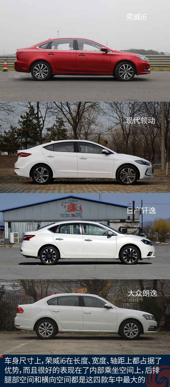 從上面的表格可以看出,榮威i6的長(zhǎng)寬高分別為4671*1835*1460mm,在寬度和長(zhǎng)度上,都要優(yōu)于其他三款車(chē)。特別是車(chē)寬,達(dá)到了1835mm,橫向的寬度不僅可以提升視覺(jué)效果,對(duì)車(chē)內(nèi)橫向空間也影響很大,尤其是后排乘坐3人的時(shí)候。在軸距上,榮威i6以2715mm的數(shù)據(jù)表現(xiàn),穩(wěn)居第一位。