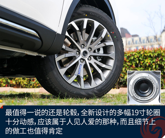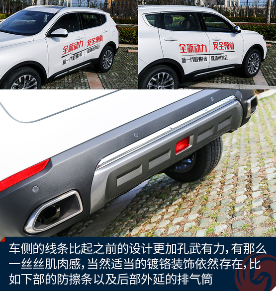 開眼角的設(shè)計雖然已經(jīng)有一陣子了,但是哈弗H6也是剛剛用上,而且頭燈的設(shè)計很簡潔,但是與六邊形的前進(jìn)氣格柵搭配的感覺剛剛好,在視覺上帶來了十分不錯的沖擊力。車側(cè)的線條比起之前的設(shè)計更加孔武有力,有那么一絲絲肌肉感,當(dāng)然適當(dāng)?shù)腻冦t裝飾依然存在,比如下部的防擦條以及后部外延的排氣筒。最值得一說的還是輪轂,全新設(shè)計的多幅19寸輪圈十分動感,應(yīng)該屬于人見人愛的那種,而且細(xì)節(jié)上的做工也值得肯定。