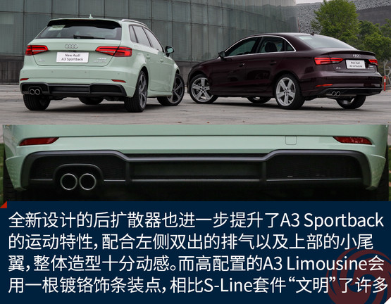 新顏色的加入讓原本青春靚麗的A3變得更加鮮嫩,雖說這樣的顏色不一定適合所有人,但是至少我是很喜歡的,應該不少女生也會心生好感。而外觀的改進進一步增加了A3的活力,棱角更加鮮明的大嘴,首次出現(xiàn)在A3上的LED矩陣大燈,以及外擴的前唇都讓這臺擁有S-Line套件的A3 Sportback攻擊性十足,同時全系都將標配氙氣大燈也是誠意滿滿。而高配置的A3 Limousine會在中網(wǎng)多一些鍍鉻裝飾來凸顯質(zhì)感,當然前唇的造型也會收斂許多。