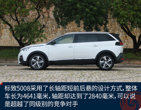 和市面上的一些7座SUV不同,標致5008采用了長軸距短前后懸的設(shè)計方式,這樣的設(shè)計更多的出現(xiàn)在運動派車型上。標致5008的整體車長為4641毫米,軸距卻達到了2840毫米,可以說是超越了同級別的競爭對手。