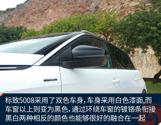 標致5008采用了雙色車身,比如我們試駕的這一輛GT-Line版車型,車身整體采用白色漆面,而車窗以上的部分則變?yōu)楹谏?,通過環(huán)繞車窗的鍍鉻條銜接,黑白兩種相反的顏色也能夠很好的融合在一起。