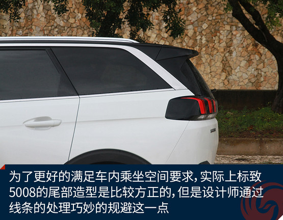 為了更好的滿足車內(nèi)乘坐空間要求,實際上標致5008的尾部造型是比較方正的,但是設(shè)計師通過線條的處理巧妙的規(guī)避這一點。側(cè)窗鍍鉻裝飾在尾部快速下滑與尾燈相連接,上面后窗的部分則用黑色處理,使得標致5008的視覺效果仍然充滿動感,同時還保留了第三排空間的實用性。