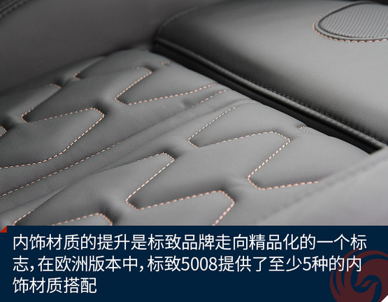 內(nèi)飾材質(zhì)的提升是標致品牌走向精品化的一個標志,在歐洲版本中,標致5008提供了至少5種的內(nèi)飾材質(zhì)搭配,比如我們試駕的這款GT-Line版本,就采用布與皮相結(jié)合的材質(zhì)選擇,座椅則采用了標致最新的經(jīng)典紋路,既美觀又保證乘坐舒適性。