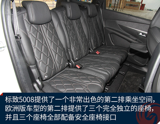 作為一款7座中型SUV,標致5008最受關(guān)注的一點就是車內(nèi)空間的體驗了,這里我就來多講一講。首先,標致5008提供了一個非常出色的第二排乘坐空間,不夸張的說2840毫米的軸距基本上就是在為第二排乘客服務(wù)的。歐洲版車型的第二排提供了三個完全獨立的座椅,并且三個座椅全部配備安全座椅接口,而國產(chǎn)車型將會改為4/6分隔的座椅類型。
