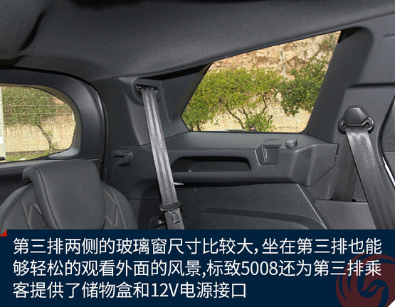 不過第三排也有值得表揚的地方,首先正如前面所說,由于車身設(shè)計的比較方正,所以第三排的頭部空間比較理想,并不覺得特別頂頭;另外,第三排兩側(cè)的玻璃窗尺寸比較大,坐在第三排也能夠輕松的觀看外面的風景;最后,標致5008還為第三排乘客提供了儲物盒和12V電源接口,能夠滿足基本的使用需求。