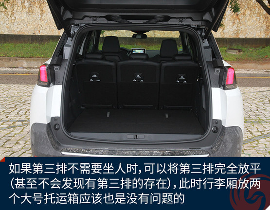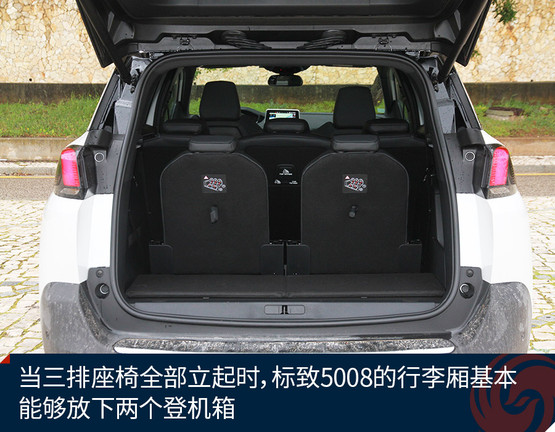 標致5008提供了三排座椅還有另外一個顯著的好處是,可以豐富行李廂的使用方式。通過實際體驗可以發(fā)現(xiàn),當三排座椅全部立起時,標致5008的行李廂基本能夠放下兩個登機箱,但如果第三排不需要坐人時,可以將第三排完全放平(甚至不會發(fā)現(xiàn)有第三排的存在),此時行李廂放兩個大號托運箱應(yīng)該也是沒有問題的。