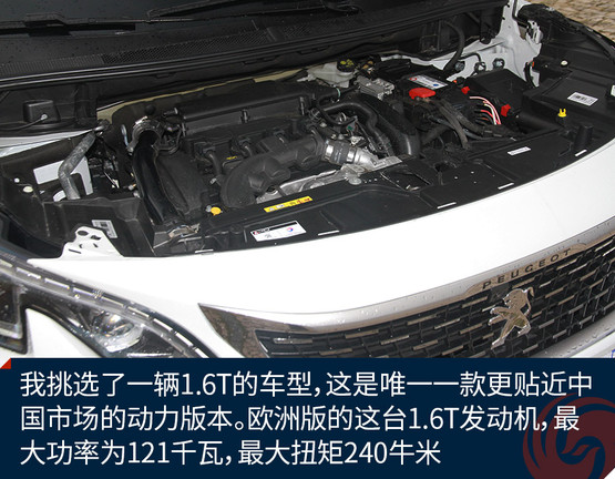 所以我挑選了一輛1.6T的車型,這是唯一一款更貼近中國市場的動力版本。歐洲版的這臺1.6T發(fā)動機,最大功率為121千瓦,最大扭矩240牛米,大概相當于國內(nèi)標致4008 1.6T的350THP版本。