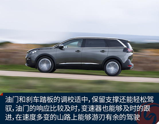 油門和剎車踏板的調(diào)校也如是,踏板腳感適中,保留支撐還能輕松駕馭,并不像多數(shù)歐系車那樣沉重。油門的響應(yīng)比較及時,變速器也能夠及時的跟進,在速度多變的山路上能夠游刃有余的駕駛。唯一的問題是低功率的1.6T在動力上沒有突出的表現(xiàn),尤其在上坡時,加速會稍感吃力,但是想到這事一款家用SUV,這也就不是問題了。而且標致5008在國內(nèi)的主力車型將會是1.8T版本,動力還會再上一個臺階。
