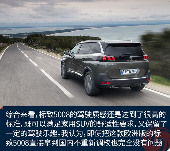 綜合來看,標致5008的駕駛質(zhì)感還是達到了很高的標準,既可以滿足家用SUV的舒適性要求,又保留了一定的駕駛樂趣。我認為,即使把這款歐洲版的標致5008直接拿到國內(nèi)不重新調(diào)校也完全沒有問題。