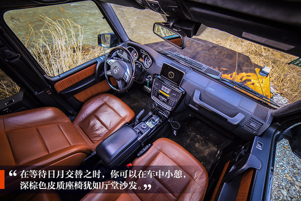 在等待日月交替之時(shí),你可以在車(chē)中小憩,方殼子造型的車(chē)體,像是一個(gè)移動(dòng)的居所,G 63 AMG中的深棕色皮質(zhì)座椅,就好似廳堂中的沙發(fā),供人高談、辨析、訴情、吹煙。中控九宮格數(shù)字“點(diǎn)唱機(jī)”,不再選擇聒噪的887,而是從中播出歲月的聲音,流出時(shí)間的經(jīng)典,隨著天色變暗,內(nèi)心也趨于平靜。