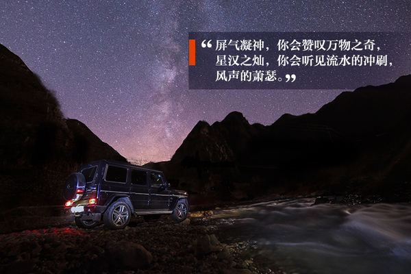 墨分五色,暗與黑之間也相隔甚遠(yuǎn),但你正可以在此時(shí),借助月光,找到一個(gè)好的觀測(cè)和拍攝角度。車(chē)這個(gè)伙伴,也在前照燈的照明下,趟過(guò)流水,踏上卵石,陪你一起等待即將而來(lái)的精彩。