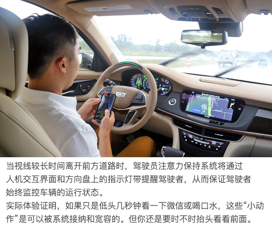 ????????原則上駕駛員應該緊盯前方,時刻準備著接管汽車的控制權(quán)。但實際上基于ACC自適應巡航系統(tǒng)的Super Cruise?超級巡航為行駛中的汽車提供了充足的“安全緩沖余量”。在底特律郊區(qū)高速公路上實際體驗證明,視線短暫的離開正前方(大約3-5秒之內(nèi))處于系統(tǒng)安全的“可接受”范圍內(nèi),比如喝水、吃東西或者調(diào)節(jié)空調(diào)多媒體娛樂系統(tǒng),這些操作都沒什么問題。