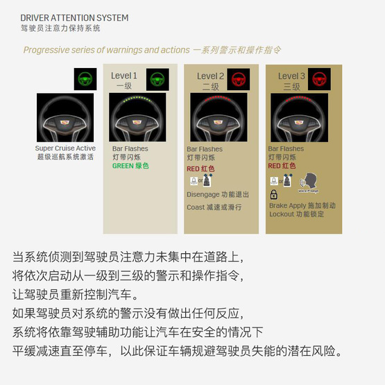 ????????若這個級別的警示還不能“喚醒”駕駛者,超級巡航系統(tǒng)將自動開啟雙閃、利用車輛輔助駕駛系統(tǒng)控制汽車逐漸減速并在路邊停車,然后OnStar安吉星工作人員將會通過遠程對話介入以防止駕駛者因為“失能”造成更多不可預知的危險。