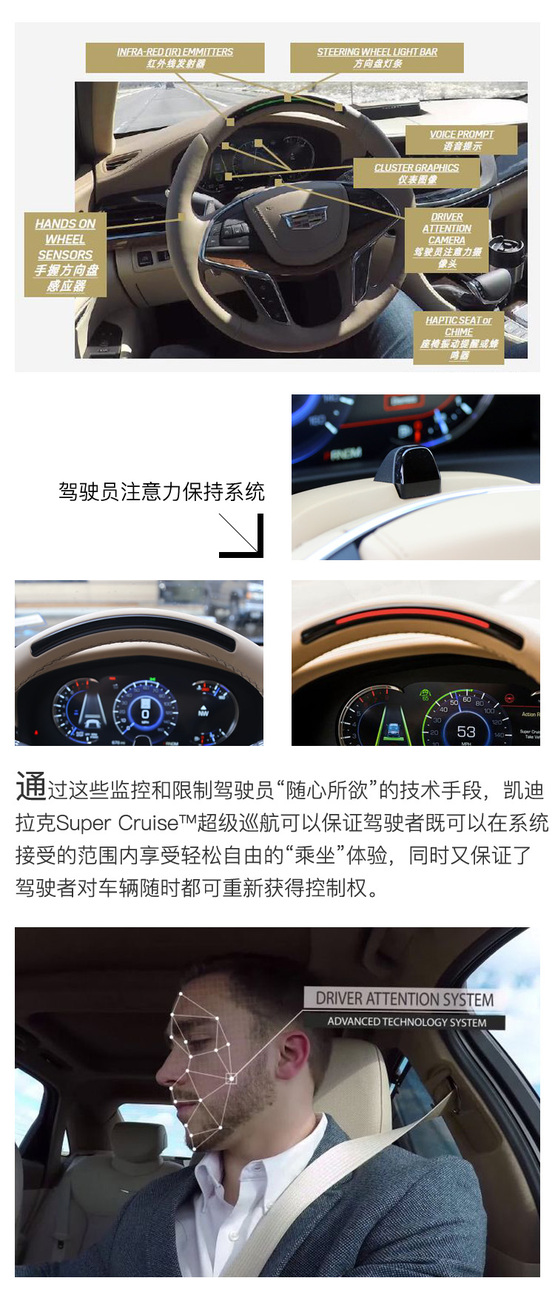 ????????但問題是,當一臺車自己好好的行駛在高速公路上,人性驅(qū)使下的駕駛員很容易把注意力轉(zhuǎn)移到其它地方,這就造成了極大的安全隱患。所以凱迪拉克Super Cruise?超級巡航系統(tǒng)最與眾不同的地方,也是讓我覺得最有價推廣價值的設計理念,是通過駕駛員注意力保持系統(tǒng)與高精度地圖數(shù)據(jù)緊密結(jié)合?,主動監(jiān)測駕駛員的狀態(tài)并做出及時回應。這套系統(tǒng)能督促駕駛者始終保持對車輛運行狀態(tài)的有效監(jiān)控,這給其釋放雙手的駕駛輔助功能帶來更安全、更自信的使用體驗。