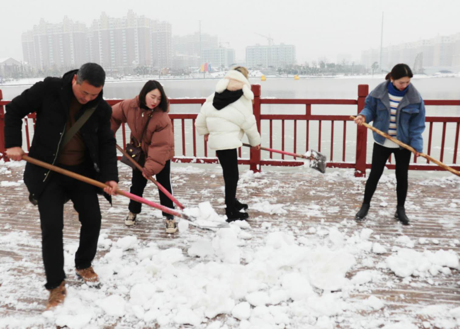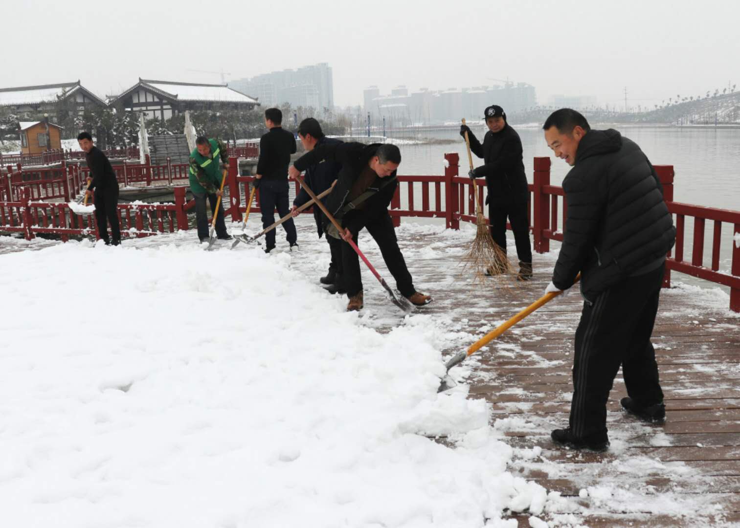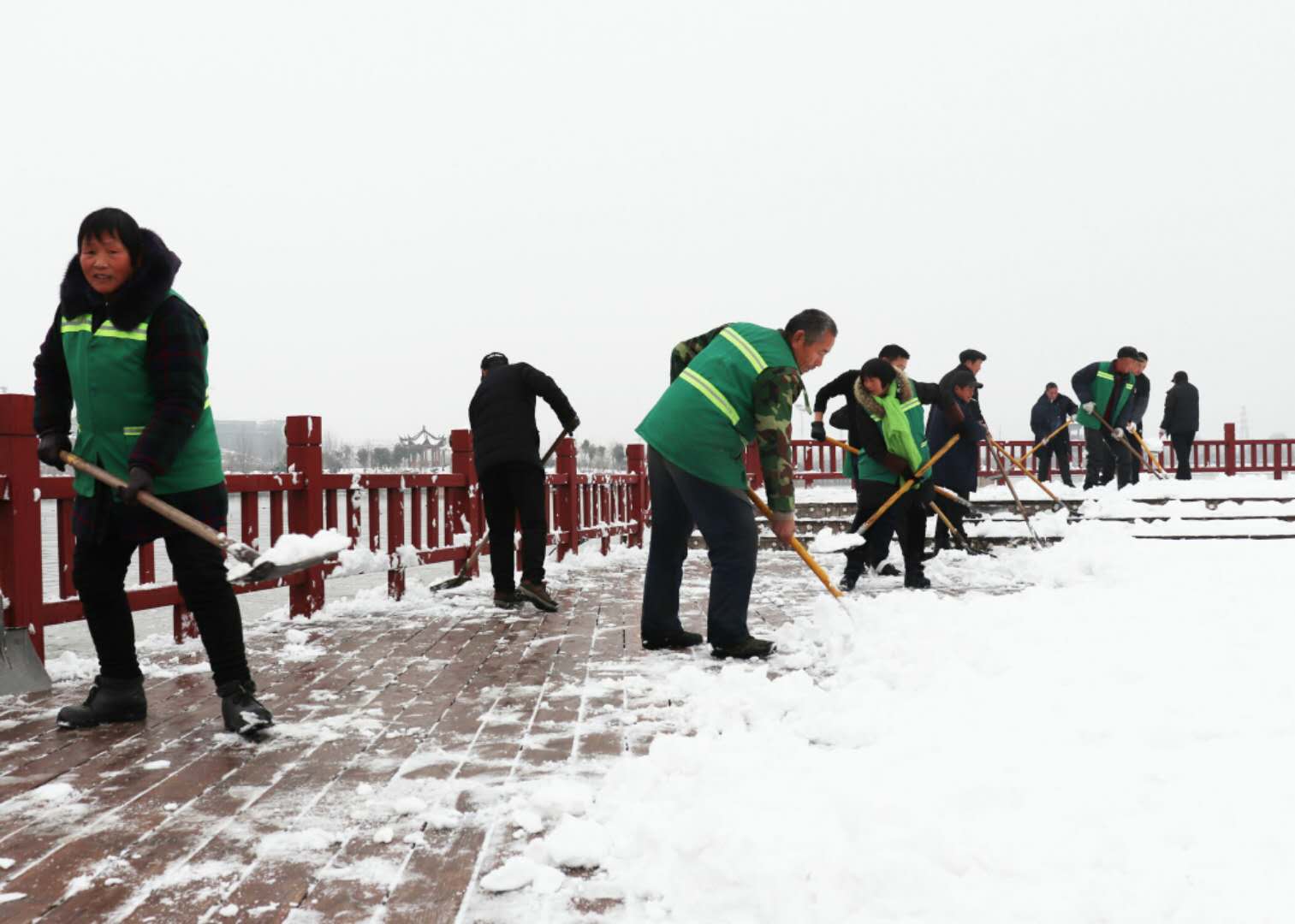 經(jīng)過兩場大雪的洗禮,空氣格外清新,但鹿邑上清湖公園內(nèi)積雪嚴(yán)重,且已結(jié)冰,給市民游園帶來了諸多不便和隱患。從早晨到下午4點半,鹿邑市政園林中心的干部職工和道德公益志愿者在上清湖集合后,投入鏟雪掃雪行動,經(jīng)過一天的緊張清掃,上清湖湖面棧道和園內(nèi)公路上的積雪清掃一遍。道德公益志愿者鐘華在微信群里提出建議后,有十幾位志愿者報名參加上清湖義務(wù)掃雪活動。