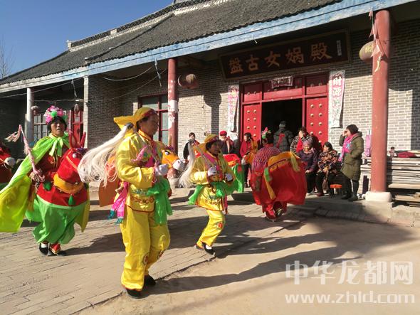 香客在盤(pán)古女?huà)z殿外表演“竹馬”。