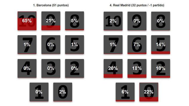 在《馬卡報(bào)》做的一系列民意調(diào)查中,球迷們?yōu)楦髦蜿?duì)和球員進(jìn)行了打分和投票。結(jié)果顯示有65%的球迷認(rèn)為巴薩的半程表現(xiàn)可以打滿分10分。而有22%的球迷為皇馬打的是1分的最低分。