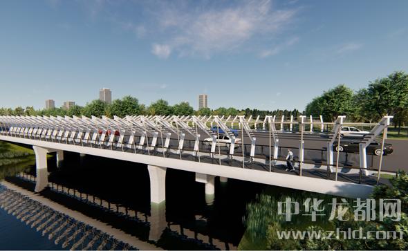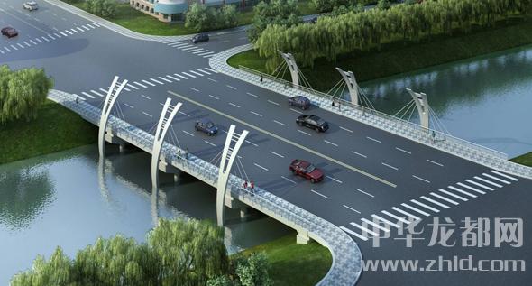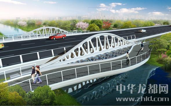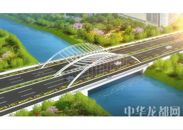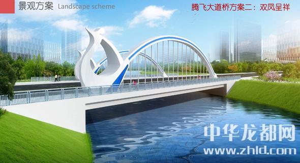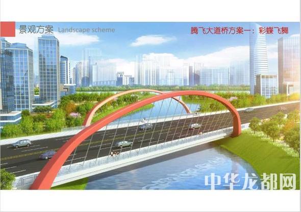 騰飛大道橋的設(shè)計(jì)方案有兩套,分別為“彩蝶飛舞”和“雙鳳呈祥”?!安实w舞”為下承式鋼管拱橋,寬36米。記者從效果圖中看到,橋兩側(cè)的拱圈,極具色彩感,給人一種賞心悅目的感覺。“雙鳳呈祥”為裝飾鋼管拱橋,寬36米。該橋采用“雙鳳”造型,象征天下太平,富含吉祥之意。