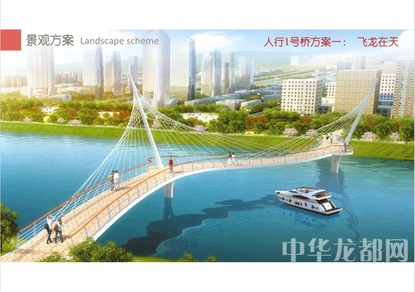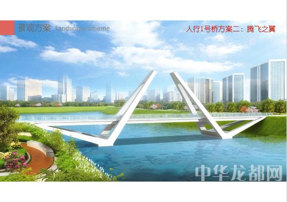 人行1號(hào)橋的設(shè)計(jì)方案有兩套,分別為“飛龍?jiān)谔臁焙汀膀v飛之翼”?!帮w龍?jiān)谔臁睘殡p塔斜拉橋。記者從效果圖中看到,該橋呈現(xiàn)出優(yōu)美的線條,宛如一條長龍騰空在天?!膀v飛之翼”為V腿連續(xù)鋼箱梁橋。記者從效果圖中看到,橋體簡潔流暢,時(shí)尚現(xiàn)代,橋墩形成穩(wěn)固的三角形,像兩只燕子展翅高飛。