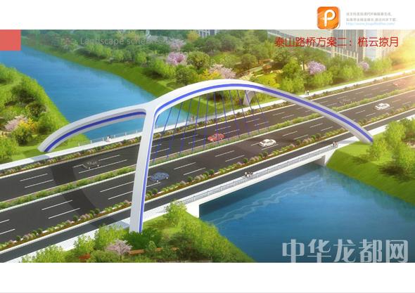泰山路橋的設(shè)計(jì)方案有兩套,分別為“錚錚鐵骨”和“梳云掠月”?!板P錚鐵骨”為下承式系桿拱橋。記者從效果圖中看到,其拱體骨架給人一種力量感,拱身視線通透,簡潔明快?!笆嵩坡釉隆睘殇摻罨炷撂峄@拱橋。記者從效果圖中看到,該橋的拱圈造型獨(dú)特,簡潔又不失大氣。