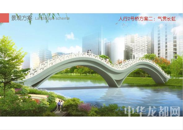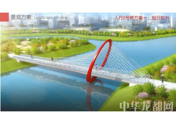 人行2號(hào)橋的設(shè)計(jì)方案有兩套,分別為“旭日東升”和“氣貫長虹”?!靶袢諙|升”為圓形塔懸索橋。記者從效果圖中看到,該橋的橋塔為圓形,猶如一輪東升的太陽,象征著城鄉(xiāng)一體化示范區(qū)蓬勃發(fā)展的未來。“氣貫長虹”為中承式系桿拱橋。該方案結(jié)合中國玉帶橋的古典元素、抽象古典幾何美學(xué),采用現(xiàn)代的設(shè)計(jì)手法,創(chuàng)作出現(xiàn)代感和中國傳統(tǒng)橋梁元素雜糅的橋梁設(shè)計(jì)。