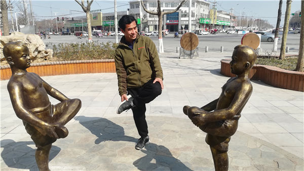 在表現(xiàn)兒童游戲“斗雞”的雕塑前,兩個(gè)光背孩童獨(dú)腿站立,分別搬著另一條腿作戰(zhàn)斗準(zhǔn)備。那生動(dòng)的畫面,令40多歲的市民尚巖青忍俊不禁,他也獨(dú)腿站在雕塑中間,像個(gè)開心的孩子一樣,搬著腿和雕塑中的頑童組成一起斗雞的場景。