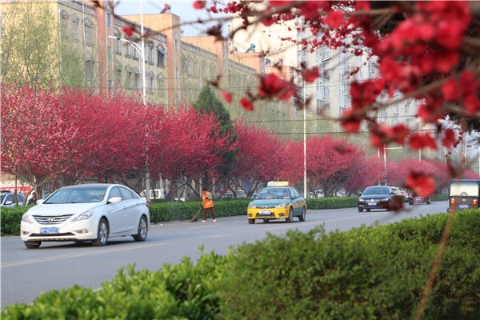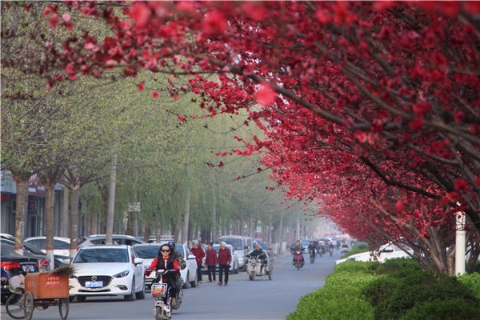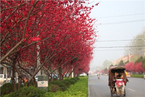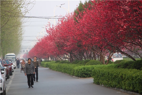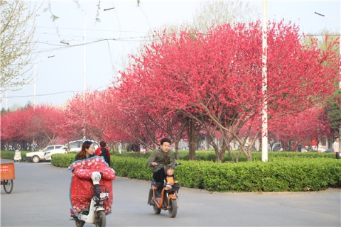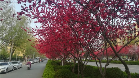 楊樹、垂柳、法桐,這是常見的綠化樹,可是你見過(guò)整條道路用桃樹做綠化的嗎?在周口市建設(shè)大道西段,長(zhǎng)達(dá)1公里的主干道兩側(cè)種滿桃樹?,F(xiàn)在正值陽(yáng)春三月桃花盛開,整條道路成了一片花的海洋,儼然是鬧市區(qū)里的世外桃源。