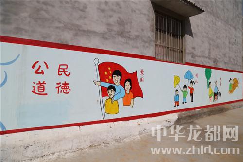 當日16時許,記者在該村看到,干凈整潔的水泥路像玉帶在村中盤旋,街道兩側栽植不久的小樹在向人們招手,坑塘四周干凈整潔,綠樹環(huán)繞,塘水清澈,梳理有致,房前屋后干凈整潔……天空中雖然下著雨,但是記者遠遠的就聽到了群眾的談笑聲和機械的轟鳴聲,走近,原來是村民們不顧天氣下雨,依然在自發(fā)地進行道路清理工作。記者看到,該村墻體文化更讓村子增加了很多的“內涵”。