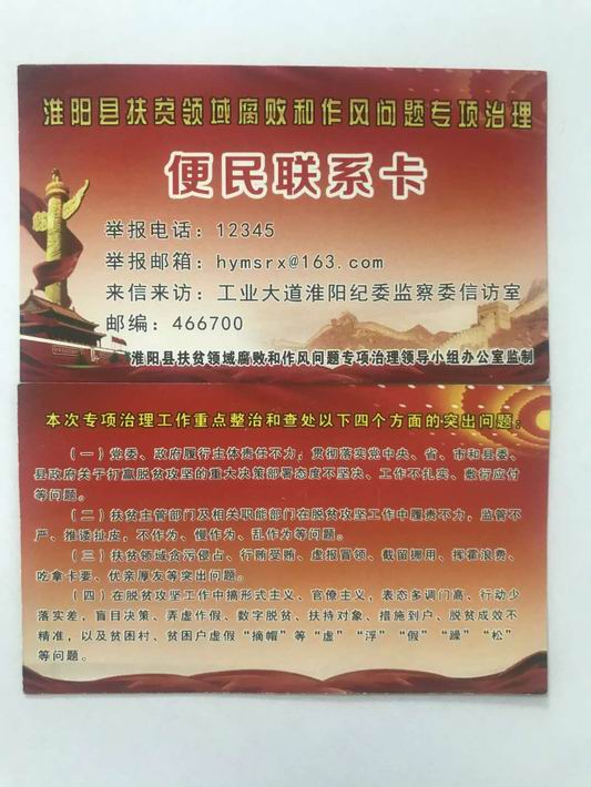 今年4月,淮陽(yáng)縣扶貧領(lǐng)域腐敗和作風(fēng)問題專項(xiàng)治理全面啟動(dòng)。為確保專項(xiàng)治理取得實(shí)效,縣紀(jì)委監(jiān)委印制發(fā)放“便民聯(lián)系卡”,進(jìn)一步加大宣傳力度,暢通信訪舉報(bào)渠道。他們統(tǒng)一制作的扶貧領(lǐng)域腐敗和作風(fēng)問題專項(xiàng)治理便民聯(lián)系卡,上面印有專項(xiàng)治理工作重點(diǎn)整治和查處的4個(gè)方面內(nèi)容。具體包括黨委、政府履行主體責(zé)任不力,脫貧攻堅(jiān)工作不扎實(shí),敷衍應(yīng)付;扶貧部門及相關(guān)職能部門脫貧攻堅(jiān)工作中不作為、慢作為、亂作為等;扶貧領(lǐng)域發(fā)生貪污侵占,虛報(bào)冒領(lǐng),截留挪用等問題。聯(lián)系卡公布了舉報(bào)電話和來信來訪地址,方便群眾對(duì)黨員干部和部門的監(jiān)督。