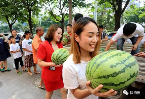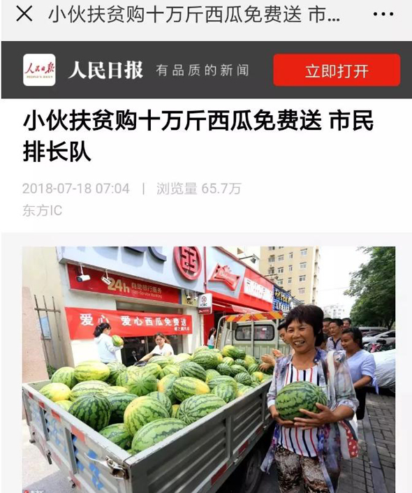 7月18日,《人民日報》客戶端播發(fā)了“小伙購十萬斤西瓜免費送 市民排長隊”的一條新聞,瞬間刷屏朋友圈,一天閱讀量就突破100萬人次,加上騰訊新聞、人民圖片截至19日發(fā)稿時閱讀量已達一百五十萬人次,評論13000多條,人們都在稱贊咱扶溝小伙宋鐵托的善舉,被網友稱他為“愛心西瓜哥”。