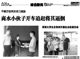 對于周口晚報的讀者朋友來說,熱心小伙陳亞輝并不算陌生——去年7月,陳亞輝曾駕駛自己的車輛逼停一位飛車搶奪項鏈的歹徒(2017年7月26日周口晚報圖文并茂報道),商水縣民政局局長朱赫受縣領(lǐng)導(dǎo)委托,到譚莊鎮(zhèn)慰問并看望陳亞輝,后來陳亞輝被商水縣委、縣政府評為“見義勇為道德模范”。