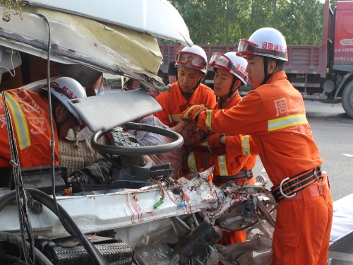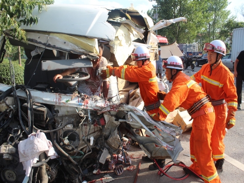 救援人員到達(dá)事故現(xiàn)場(chǎng)后看到,一輛依維柯小型貨車(chē)與一輛小型罐車(chē)發(fā)生激烈碰撞。小型貨車(chē)車(chē)頭嚴(yán)重變形,事故現(xiàn)場(chǎng)一片狼藉,玻璃碎片、鐵皮、散落一地,駕駛室內(nèi)司機(jī)被牢牢卡在座椅上不能動(dòng)彈。