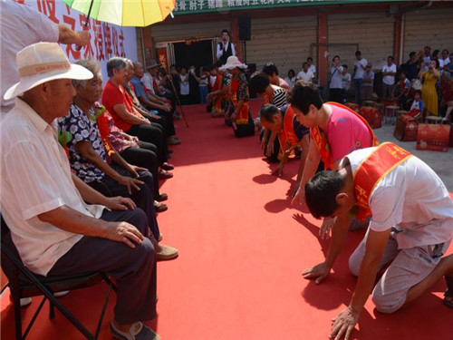 鄉(xiāng)長吳國鋒發(fā)表了熱情洋溢的致辭。他首先代表平店鄉(xiāng)黨委、政府、人大向受到表彰的先進模范和先進家庭表示熱烈的祝賀并致以崇高的敬意。并詳細闡述了開展“孝善敬老讓愛回家、孝賢之星表彰授牌暨解決獨居老年人問題、助力脫貧攻堅的重大意義,他希望受到表彰的先進代表和家庭要珍惜榮譽、再接再厲,繼續(xù)弘揚尊老、敬老、養(yǎng)老、愛老的傳統美德,推動全鄉(xiāng)“孝善敬老”文化不斷邁向新臺階?;顒蝇F場宣讀了《平店鄉(xiāng)人民政府敦促將被贍養(yǎng)人接入安全住房共同生活的通告》;與會領導為孝賢之家頒獎授牌;28個“孝子孝媳”在臺上統一施行叩拜大禮;活動結束后,鄉(xiāng)政府指派3名班子領導和10多名工作人員,分別乘坐6臺輛,由嗩吶隊開路,風風光光把28個老人送回了家。一路引來不少群眾駐足注目觀看,廣大群眾對此嘖嘖稱贊、拍手稱快。