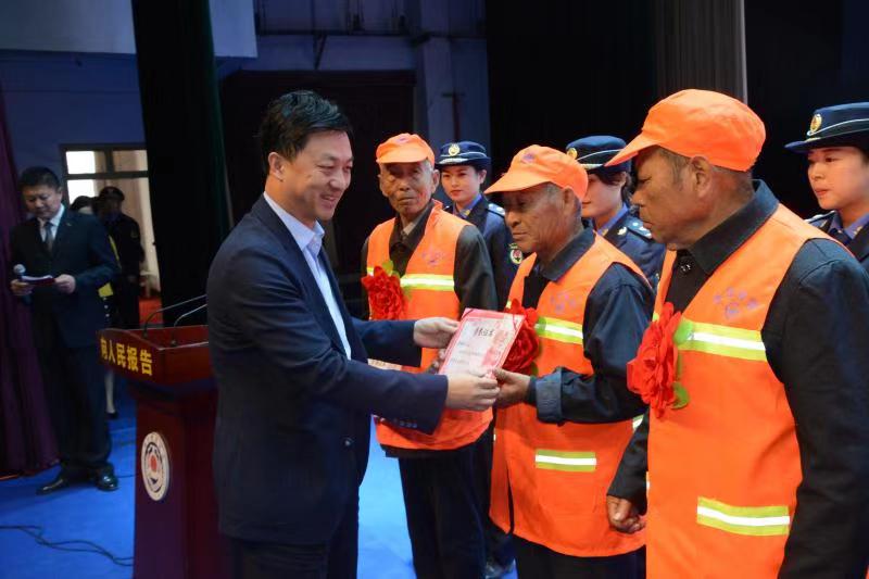 隨后,獲獎環(huán)衛(wèi)工代表戴著大紅花走上主席臺,接受西華縣委書記林鴻嘉的頒獎?!翱h委對城市管理特別是環(huán)衛(wèi)工人們的辛苦、辛勞看在眼里、記在心里,在財力十分緊張的情況下,連續(xù)5年為環(huán)衛(wèi)工人普漲工資,每人每月增加100元。今天,我宣布:從明年元月開始,給環(huán)衛(wèi)工人再增加100元的工資?!绷著櫦魏榱恋脑捯魟偮洌_下就爆發(fā)出長時間的掌聲,有些環(huán)衛(wèi)工人一邊鼓掌一邊流淚,幸福的淚花在眼圈里打轉(zhuǎn)。