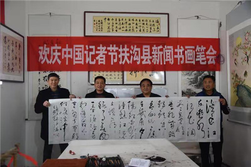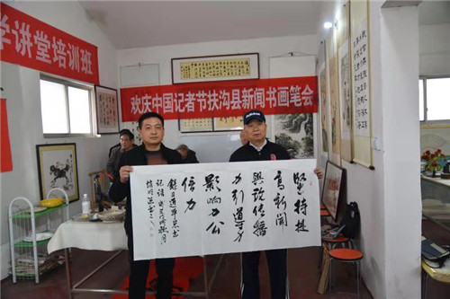 筆墨寫春秋,重彩頌佳節(jié)。為慶祝第19個中國記者節(jié),在扶溝縣的張坡詩詞名人書畫館,來自省書法家協(xié)會的書法家與當地新聞宣傳部門的書畫愛好者們齊聚一堂,以舉行書畫筆會的形式向新聞媒體人慶賀節(jié)日。