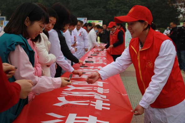 圖為在趕來參加活動(dòng)的群眾和醫(yī)護(hù)人員共同在預(yù)防艾滋病百米長(zhǎng)卷上簽名。