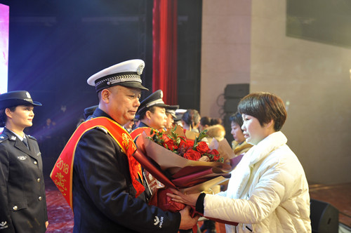晚會(huì)現(xiàn)場,頒獎(jiǎng)環(huán)節(jié)和文藝節(jié)目輪番呈現(xiàn),精彩紛呈。由32個(gè)民警子女上演的情景劇《天之大》,警寶們用稚嫩的聲音唱出了警察家庭的付出和他們對父母的愛,讓現(xiàn)場觀眾流下感動(dòng)的淚水;最后一個(gè)頒獎(jiǎng)環(huán)節(jié),當(dāng)15名警嫂手捧鮮花獎(jiǎng)杯走上舞臺(tái)為他們從警10年、20年、30年的愛人頒獎(jiǎng)時(shí),整個(gè)舞臺(tái)愛意濃濃。