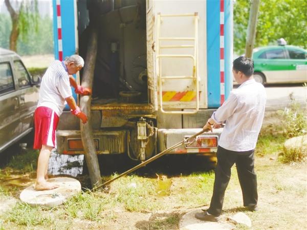 站在公廁旁的污水邊,該負(fù)責(zé)人指揮專門(mén)處理糞液的車輛到達(dá)現(xiàn)場(chǎng),并就該公廁的情況向記者進(jìn)行說(shuō)明?!斑@個(gè)公廁是由市園林處負(fù)責(zé)修建的,建好投入使用的時(shí)候就沒(méi)有鋪設(shè)污水管道,只配套了一個(gè)能容納9立方米污水的化糞池。因?yàn)楦浇行V場(chǎng),健身的市民多,公廁使用的頻率高,一個(gè)化糞池不夠用,我們又增加了一個(gè)能夠容納10立方米污水的化糞池,定期進(jìn)行清理?!痹撠?fù)責(zé)人說(shuō)。