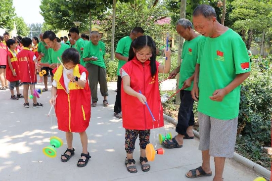 敬老院的老人們也不甘落后,孩子們表演結(jié)束后,老人們也向孩子們表演了拿手絕活——抖空竹。只見(jiàn),小小的空竹在老人們手中忽高忽低、時(shí)快時(shí)慢,各種令人嘆為觀止的花樣動(dòng)作,猶如行云流水、連綿不斷,引得孩子們齊聲叫好。學(xué)生們紛紛上前,從老人手里接過(guò)空竹,一邊討教一邊聯(lián)系,歡聲笑語(yǔ)不時(shí)在敬老院上空回蕩。